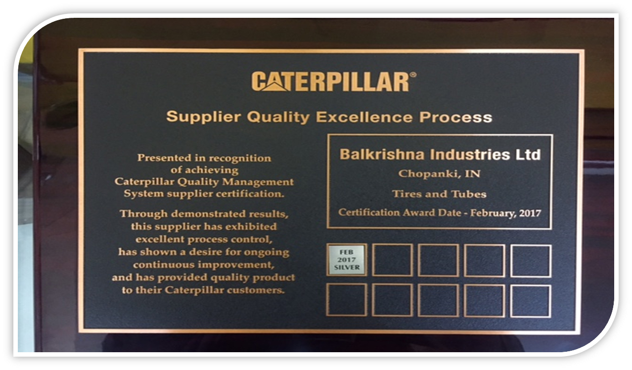 Αυτή είναι μια ακόμη επιτυχία για τη BKT που, χάρη στο εργοστάσιο της στο Chopanki, κατάφερε να αποσπάσει από την Caterpillar το SQEP Silver Award, τοποθετώντας την μεταξύ των καλύτερων προμηθευτών της Caterpillar. Πιστοποίηση που απονέμει την δέσμευση της ινδικής πολυεθνικής εταιρείας να προσφέρει υψηλής ποιότητας λύσεις που αποδεικνύουν την προσοχή στην απόδοση των προϊόντων καθώς και στην έρευνα για την αειφορία και την καινοτομία.
